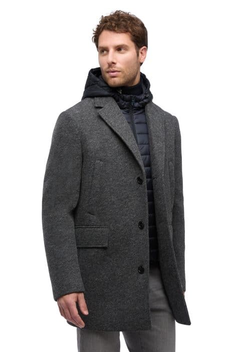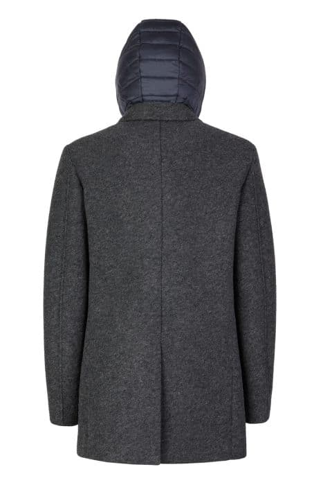 Wind-resistant coat for men packed with metropolitan appeal and featuring a contemporary functional design meant for city life. It has been crafted from a bonded polyester-wool-blend cloth cast in a versatile grey shade and completed with a handy detachable padded hooded bib. Claudio is an ideal solution for everyday urban dressing and offers outstanding comfort and Respira™ breathability, even when temperatures plummet.