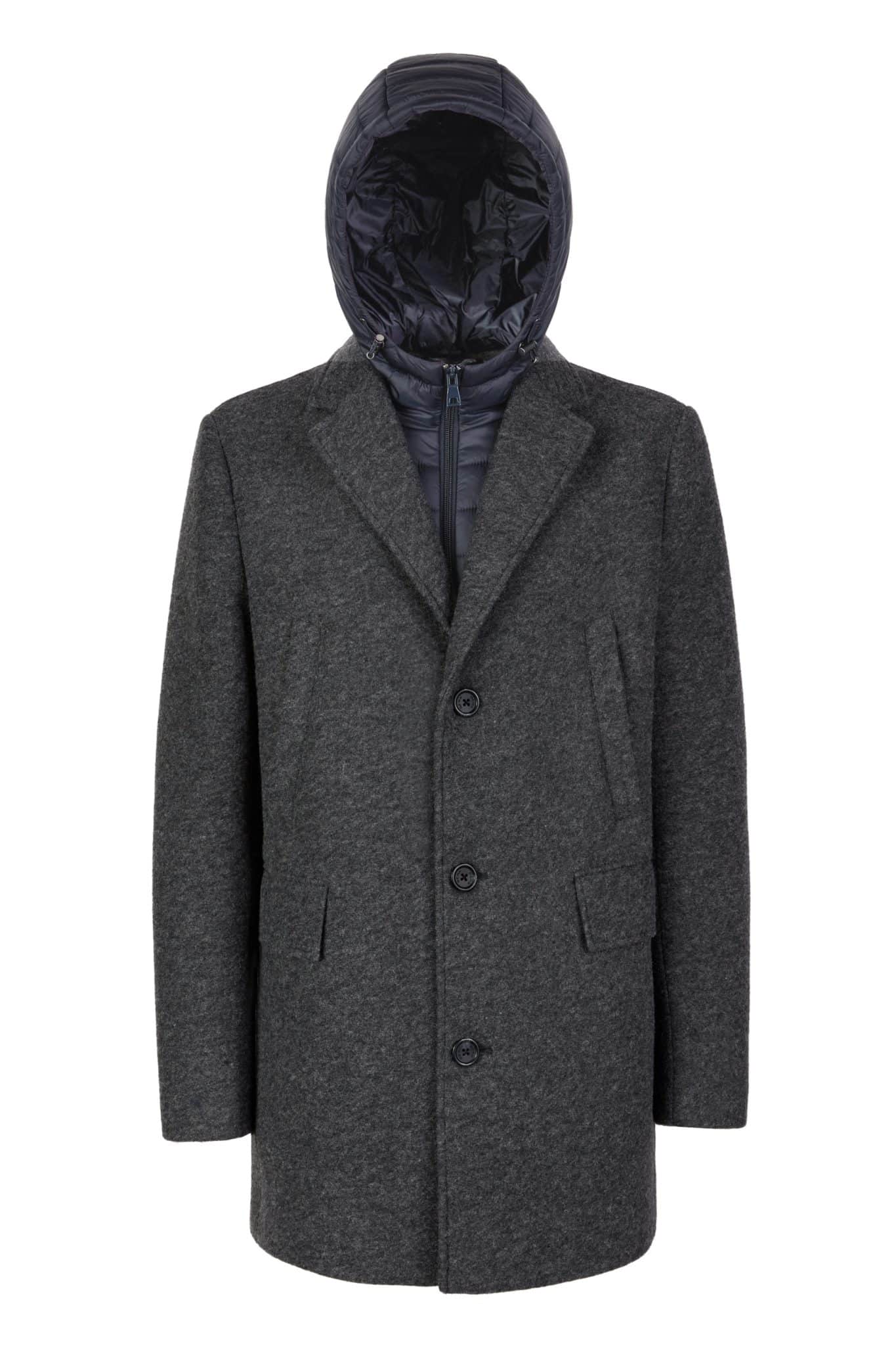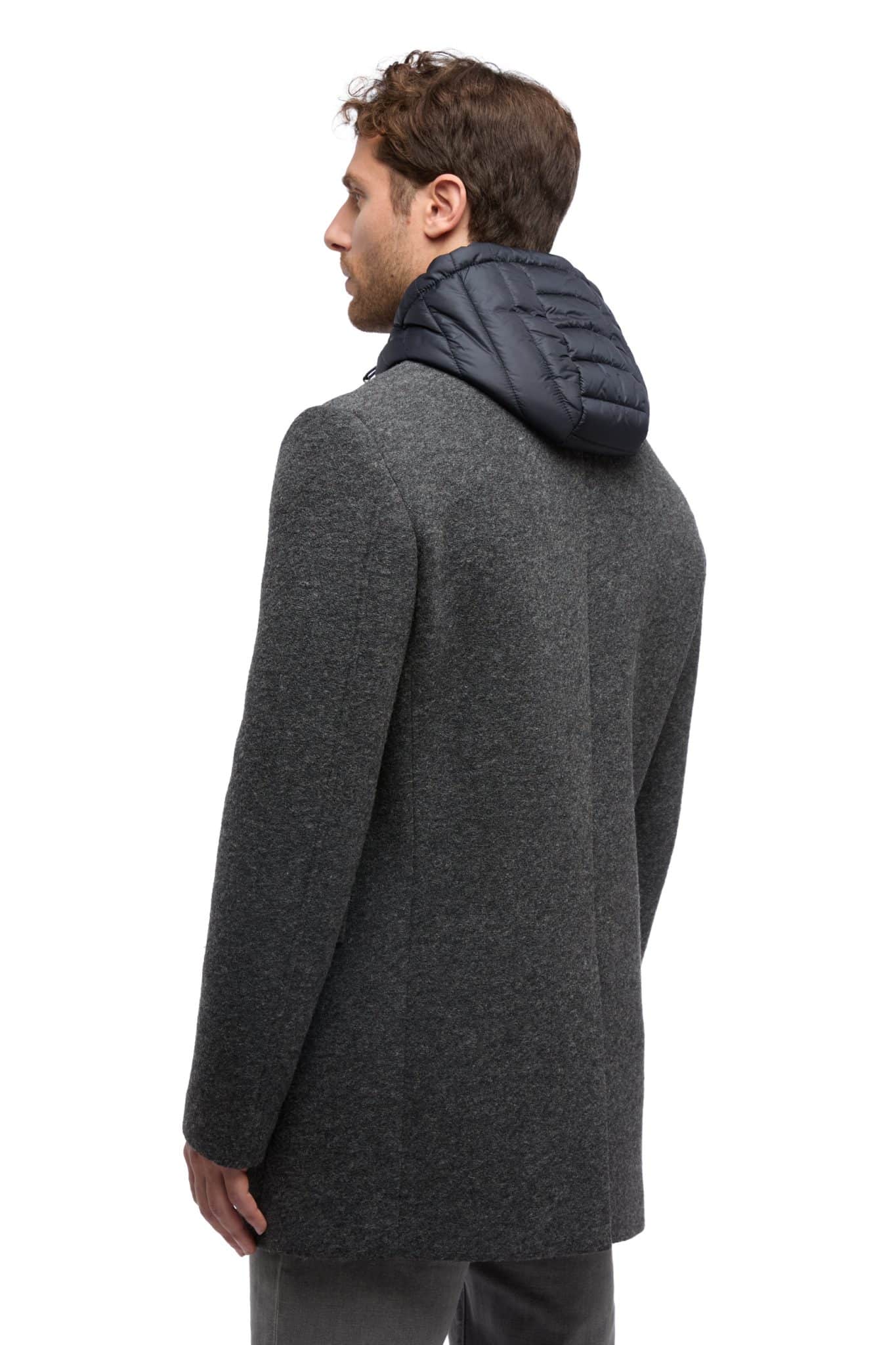 Wind-resistant coat for men packed with metropolitan appeal and featuring a contemporary functional design meant for city life. It has been crafted from a bonded polyester-wool-blend cloth cast in a versatile grey shade and completed with a handy detachable padded hooded bib. Claudio is an ideal solution for everyday urban dressing and offers outstanding comfort and Respira™ breathability, even when temperatures plummet.